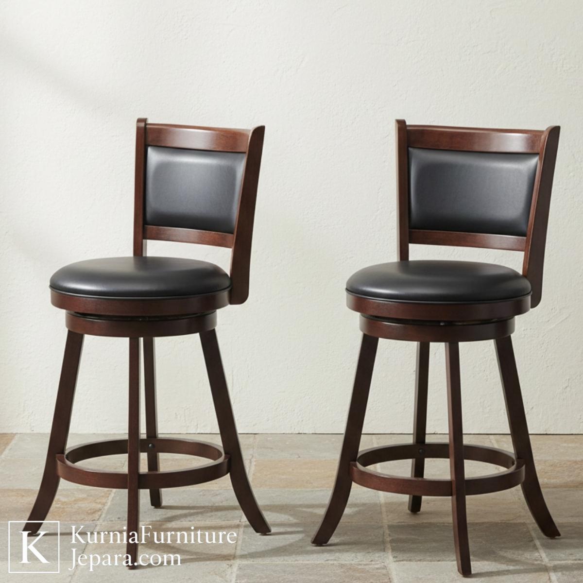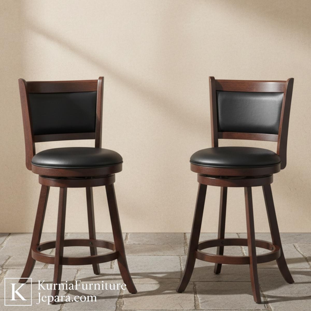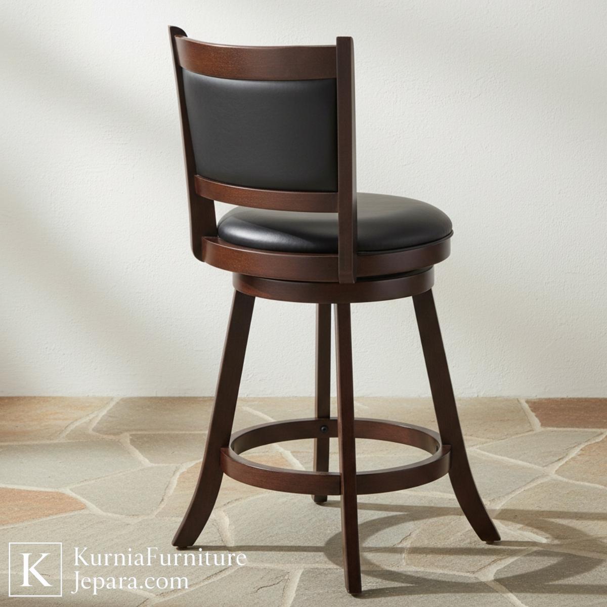 Bangku kursi cafe kayu dengan dudukan kulit hitam dan sandaran empuk