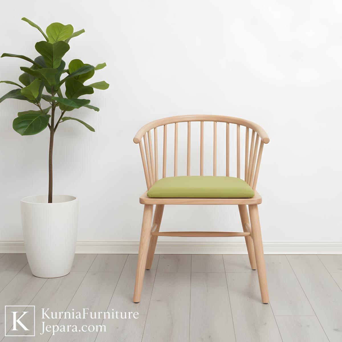 Untuk material, bangku kursi cafe ini dibuat dari kayu solid pilihan yang dikenal kuat dan tahan lama. Kayu diproses dengan pengeringan yang baik sehingga lebih stabil dan tidak mudah berubah bentuk. Finishing natural diaplikasikan secara halus untuk menampilkan serat kayu yang indah sekaligus memberikan perlindungan pada permukaan. Bantalan duduk menggunakan busa empuk berkualitas dengan lapisan kain berwarna hijau lembut yang memberi aksen segar dan modern.