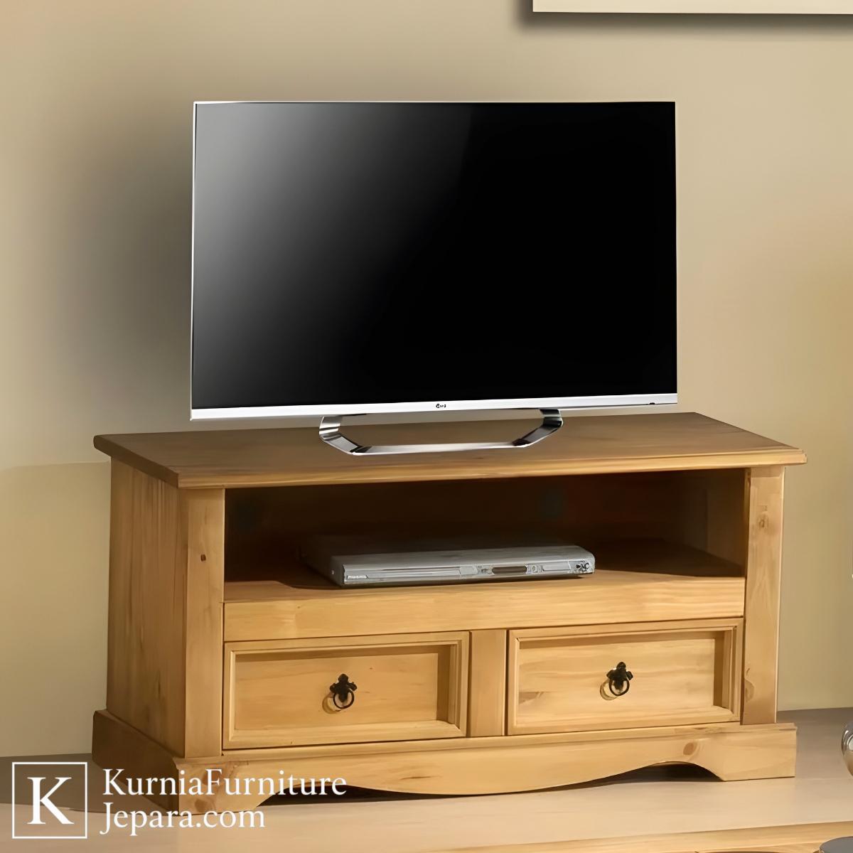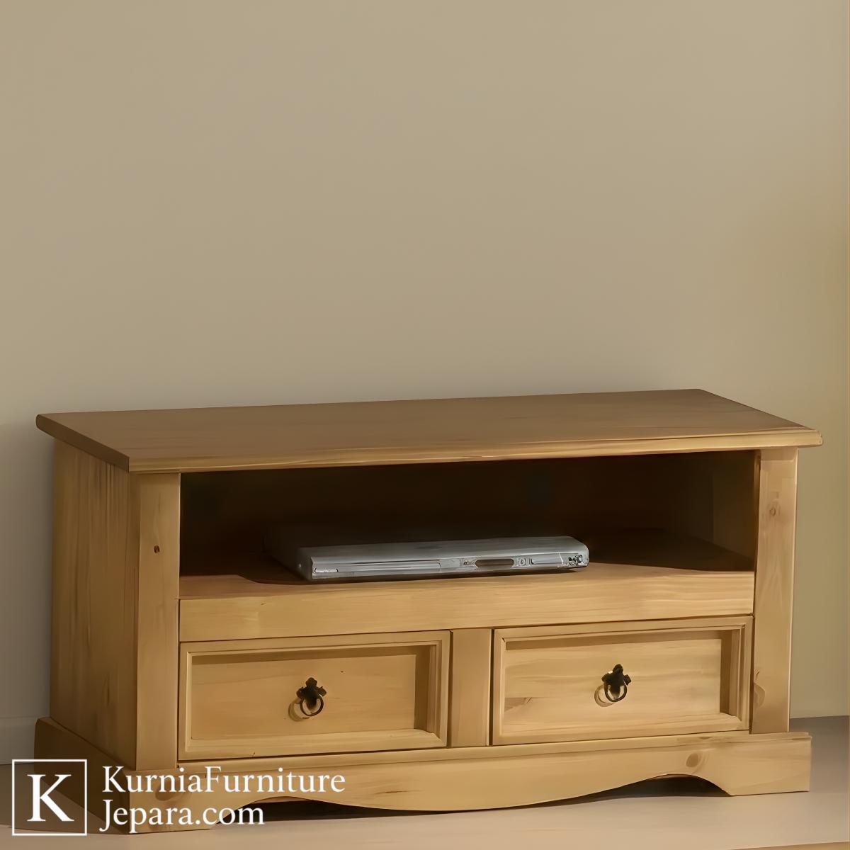 Rak TV kayu sederhana warna natural dengan laci dan rak terbuka