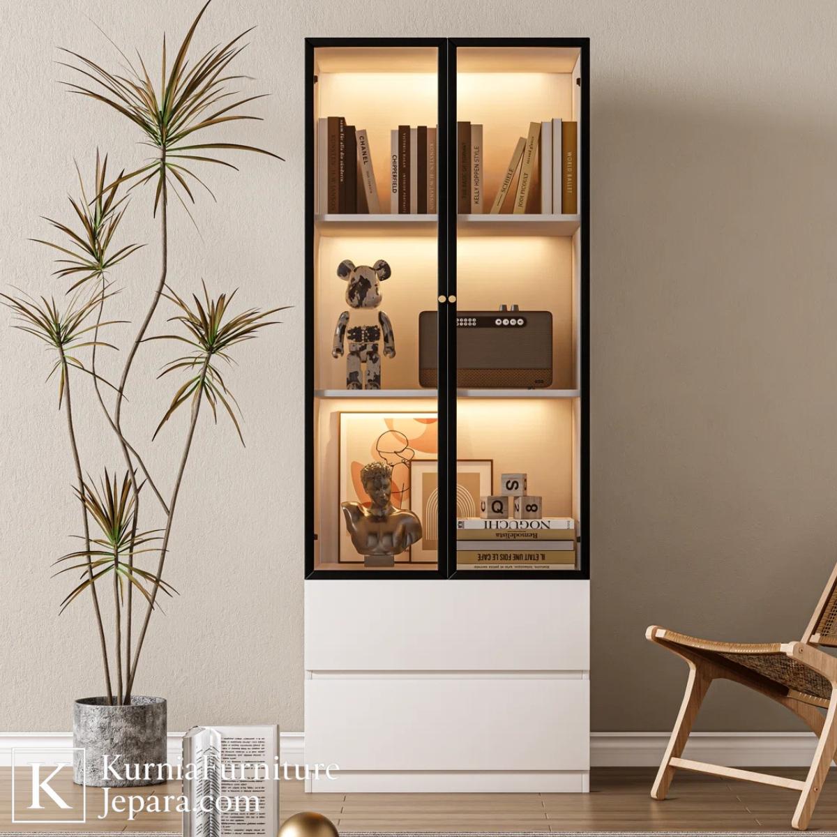 Kabinet kaca yang diterangi lampu memberikan sentuhan visual yang menarik, terutama saat malam hari, menjadikan ruangan terasa lebih hidup dan hangat.