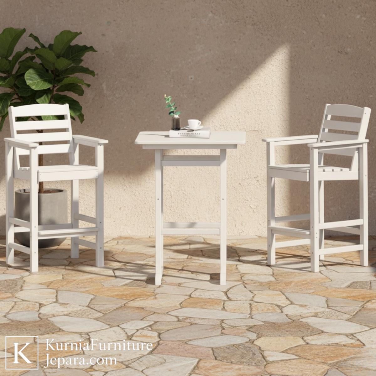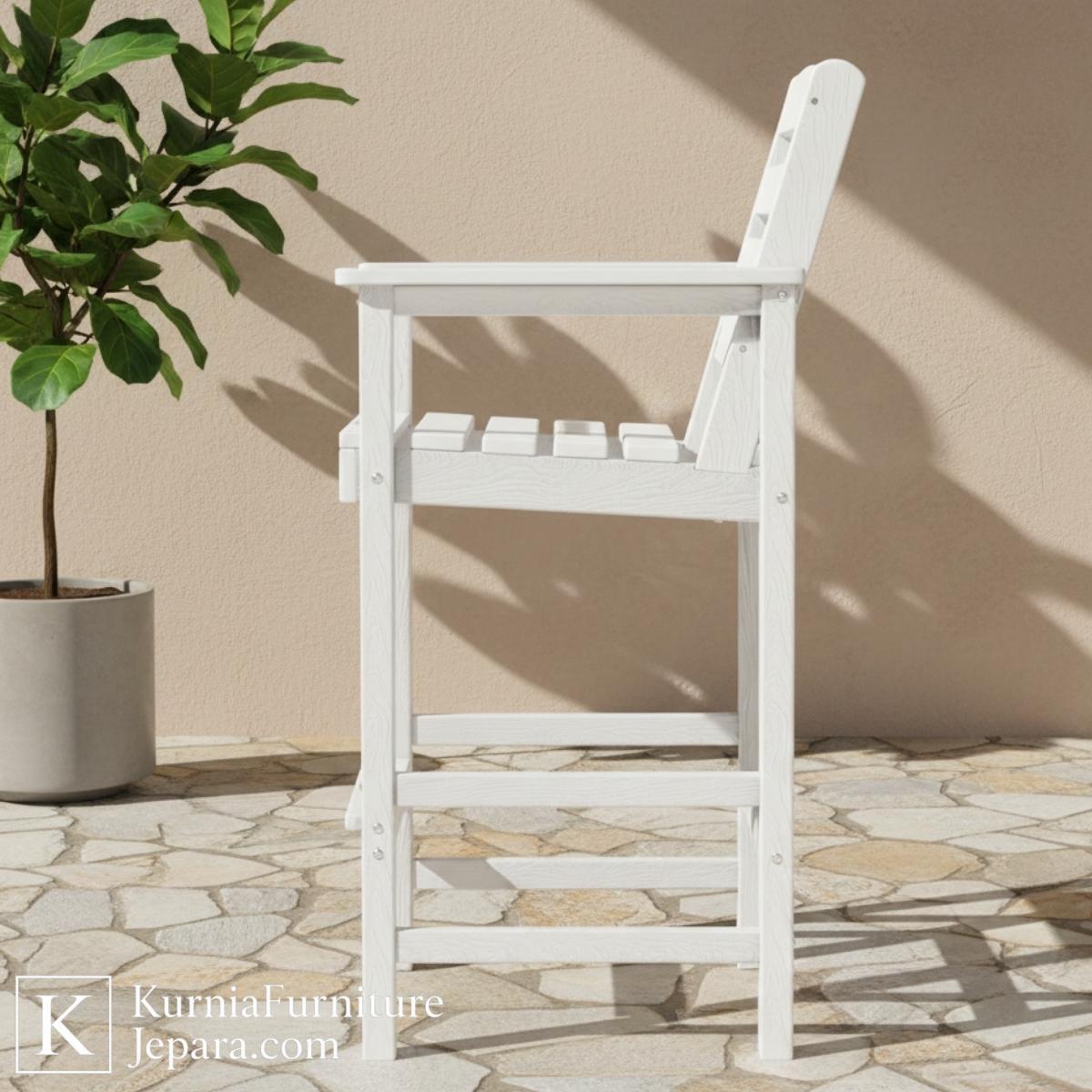 Struktur rangka yang kokoh dengan penopang silang di bagian bawah memberikan stabilitas tinggi meskipun digunakan di area terbuka. Kombinasi desain yang bersih dan warna putih matte menjadikan kursi ini mudah dipadukan dengan berbagai gaya dekorasi outdoor, dari minimalis modern hingga gaya kafe tropis.