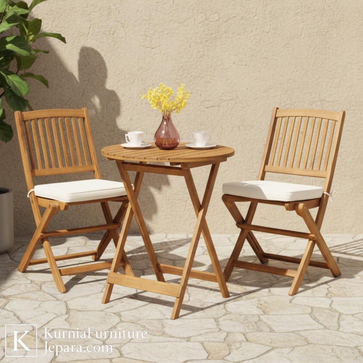 Dari sisi desain, kursi set outdoor ini menampilkan gaya minimalis dengan sentuhan artistik pada bentuk rangka dan detail bilah kayu pada sandaran. Kursi dibuat dengan rangka lipat yang kokoh dan presisi, memberikan kesan ringan sekaligus fungsional. Meja bulat di tengah melengkapi tampilan set ini dengan kaki silang yang stabil dan desain yang simpel namun elegan. Keseluruhan bentuknya dirancang agar mudah ditata dan dipindahkan sesuai kebutuhan ruang, menjadikannya solusi praktis untuk berbagai ukuran area outdoor.