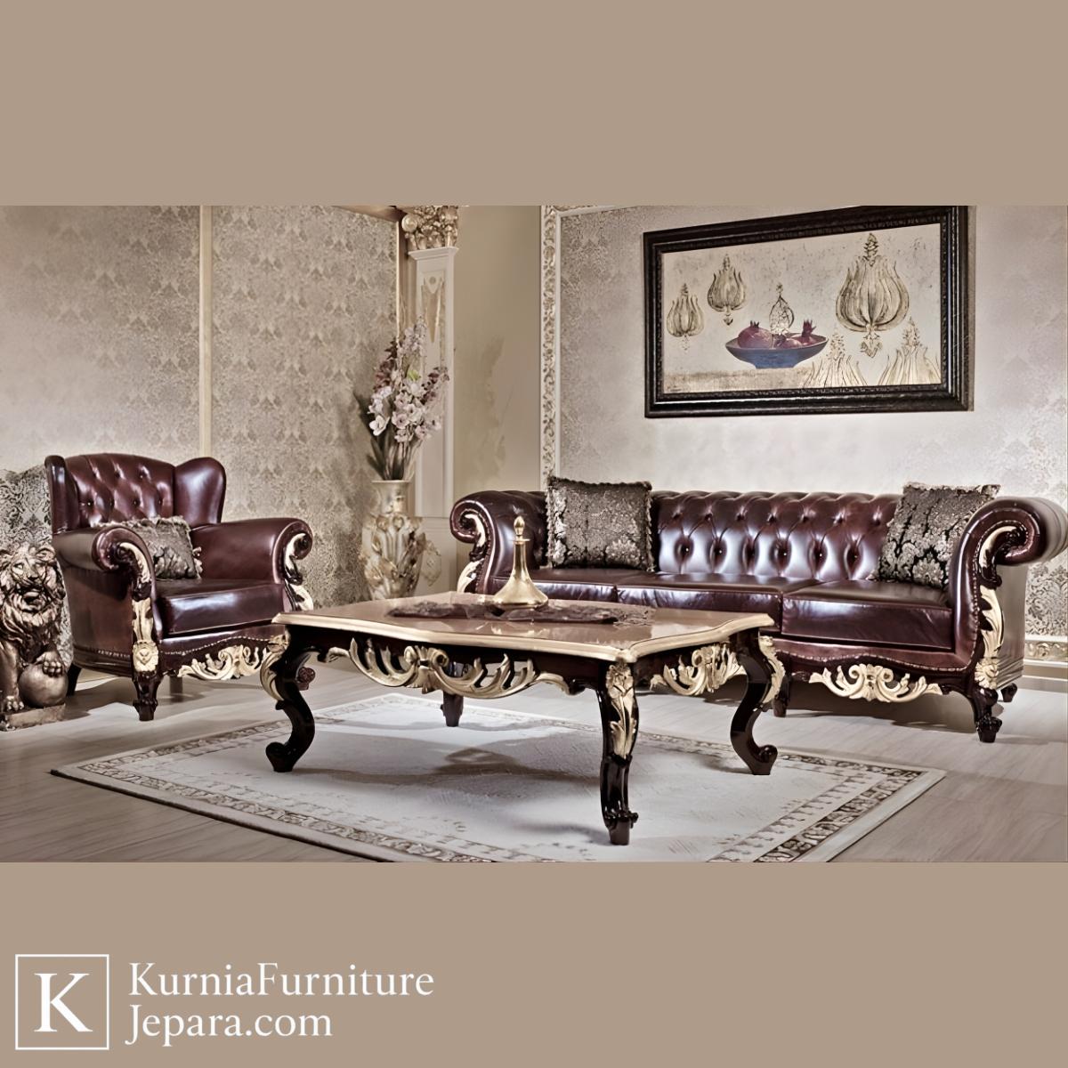 Kombinasi sofa utama, kursi single, dan meja ukir menciptakan tata ruang yang seimbang dan elegan. Desain seperti ini sangat cocok untuk ruang tamu luas maupun ruang tamu utama yang ingin menonjolkan kesan luxury dan eksklusif. Kursi tamu ini secara visual langsung menjadi focal point ruangan.