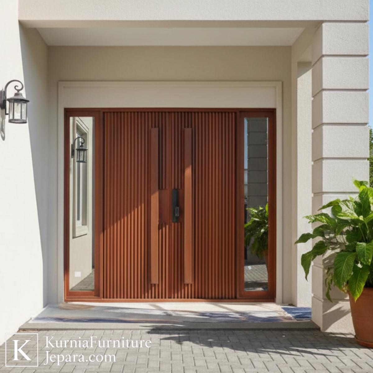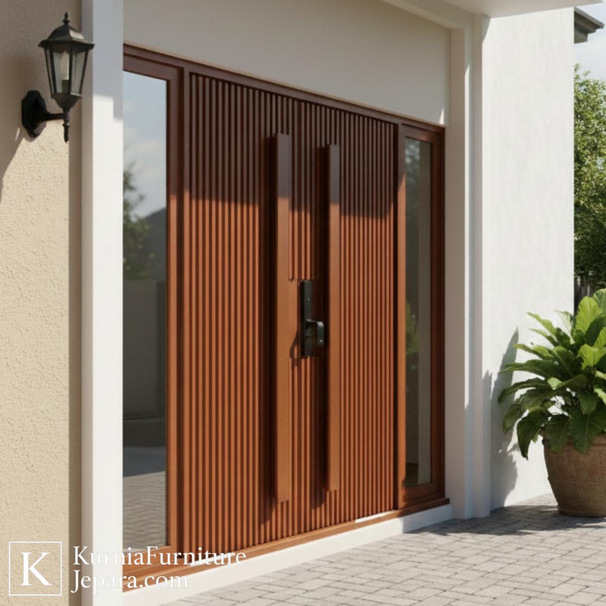 Dari sisi desain produk, kusen pintu kayu jati Jepara ini mengedepankan komposisi garis-garis vertikal yang rapi dan presisi. Pola vertikal tersebut memberikan ilusi visual yang membuat fasad rumah tampak lebih tinggi dan proporsional. Desain minimalis tanpa ornamen berlebihan menjadikan tampilannya bersih dan modern, sangat cocok untuk hunian yang mengutamakan kesederhanaan namun tetap ingin terlihat eksklusif. Model ini mudah dipadukan dengan berbagai konsep arsitektur, mulai dari minimalis modern, modern tropis, hingga kontemporer, tanpa kehilangan identitasnya sebagai pintu utama yang menonjol.
