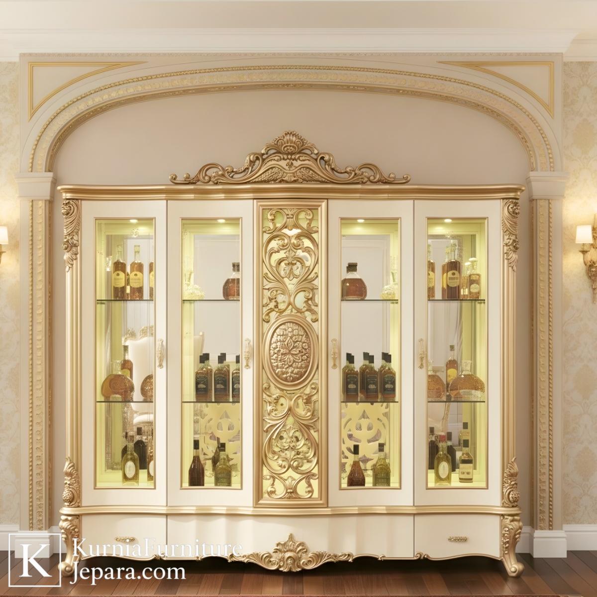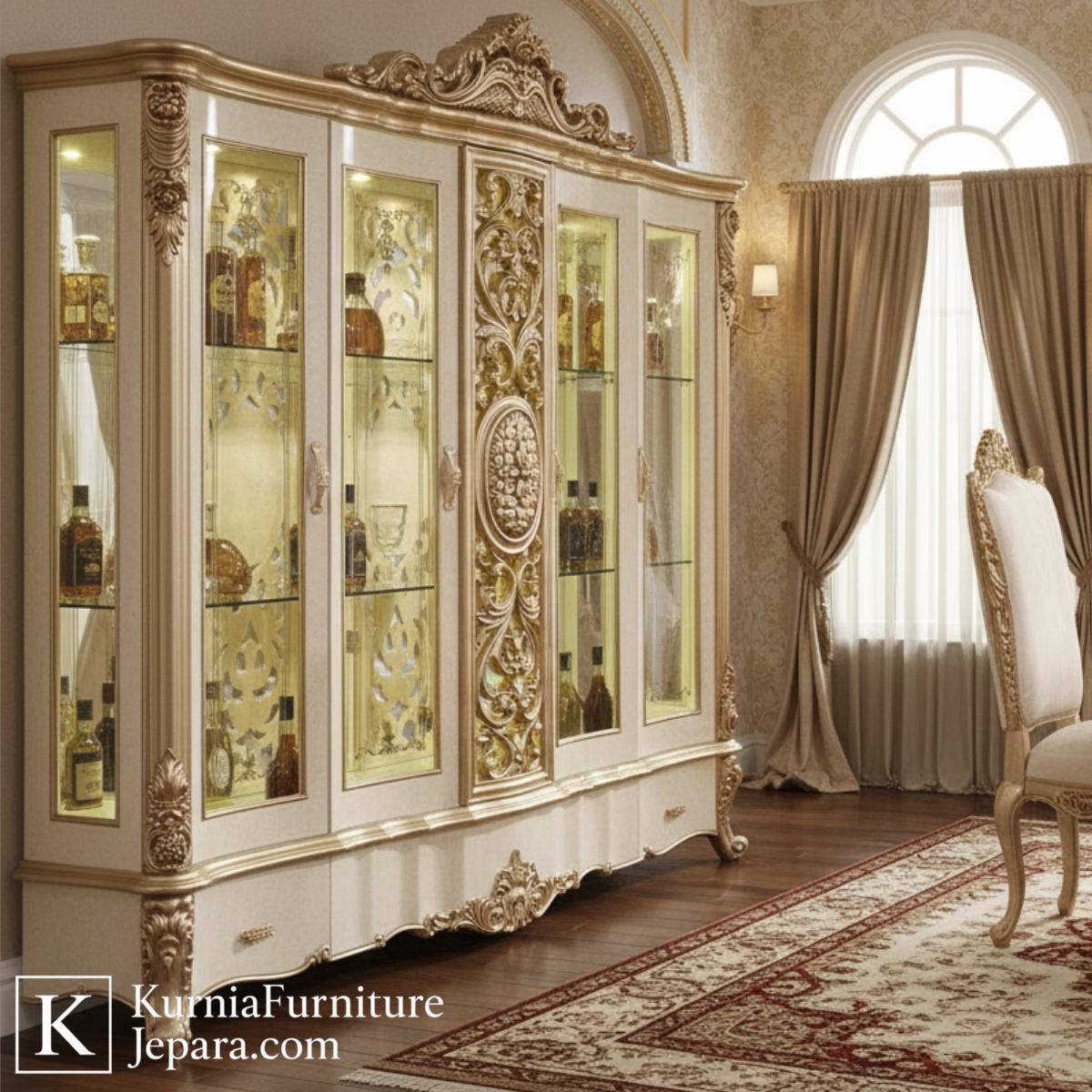 Dari sisi estetika, warna putih krem berpadu dengan sentuhan emas pada ukiran memberikan kesan terang, hangat, dan mewah tanpa terlihat berlebihan. Lemari ini mampu memantulkan cahaya ruangan sehingga ruang terasa lebih luas dan bersih. Baik diletakkan di ruang tamu, ruang makan, atau ruang keluarga, lemari ini akan selalu tampil dominan namun tetap menyatu dengan interior.