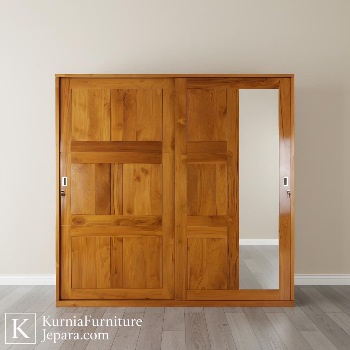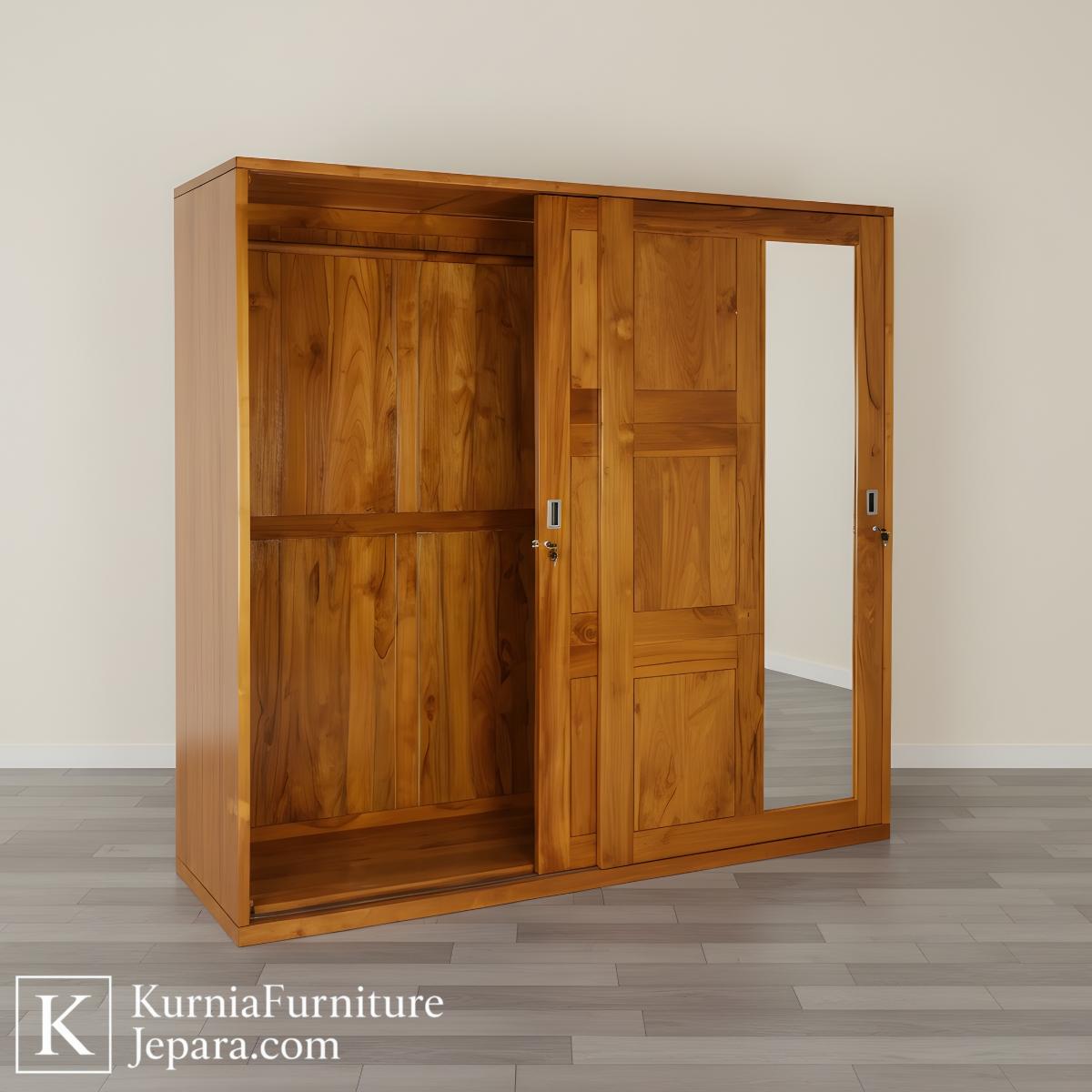 Desain lemari kayu jati mewah ini mengusung konsep modern elegan dengan sistem pintu geser. Model sliding door sangat ideal untuk ruangan masa kini karena hemat tempat dan praktis digunakan. Salah satu pintu dilengkapi panel cermin besar yang berfungsi ganda sebagai kaca rias sekaligus memberi efek visual ruangan terasa lebih luas dan terang. Garis desain tegas dan proporsi seimbang menciptakan tampilan rapi, eksklusif, dan berkelas.