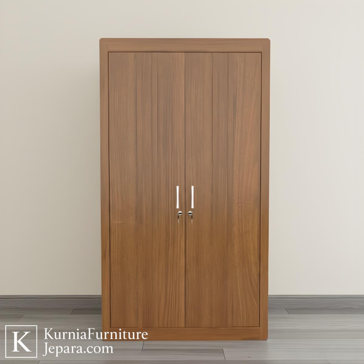Desain lemari kayu solid ini mengusung konsep minimalis modern dengan garis-garis tegas dan tampilan bersih. Bentuknya proporsional dan tidak berlebihan, sehingga mudah dipadukan dengan berbagai gaya interior. Model pintu ayun memberikan akses yang luas ke bagian dalam lemari, memudahkan Anda dalam menyimpan dan mengambil barang. Warna kayu natural dengan serat yang terlihat jelas menciptakan kesan hangat dan nyaman di dalam ruangan.