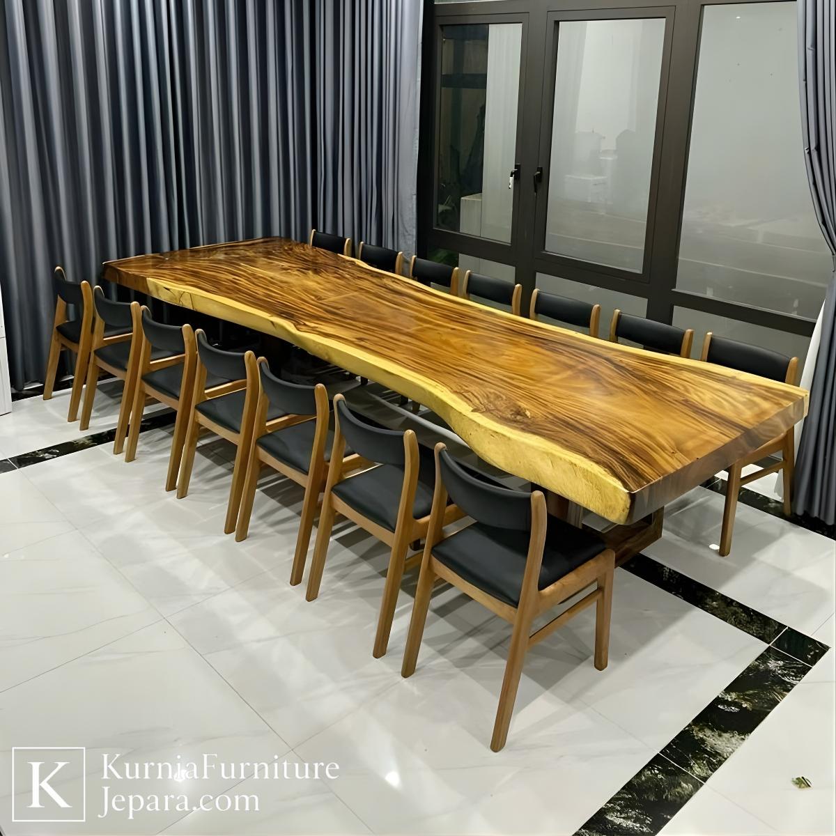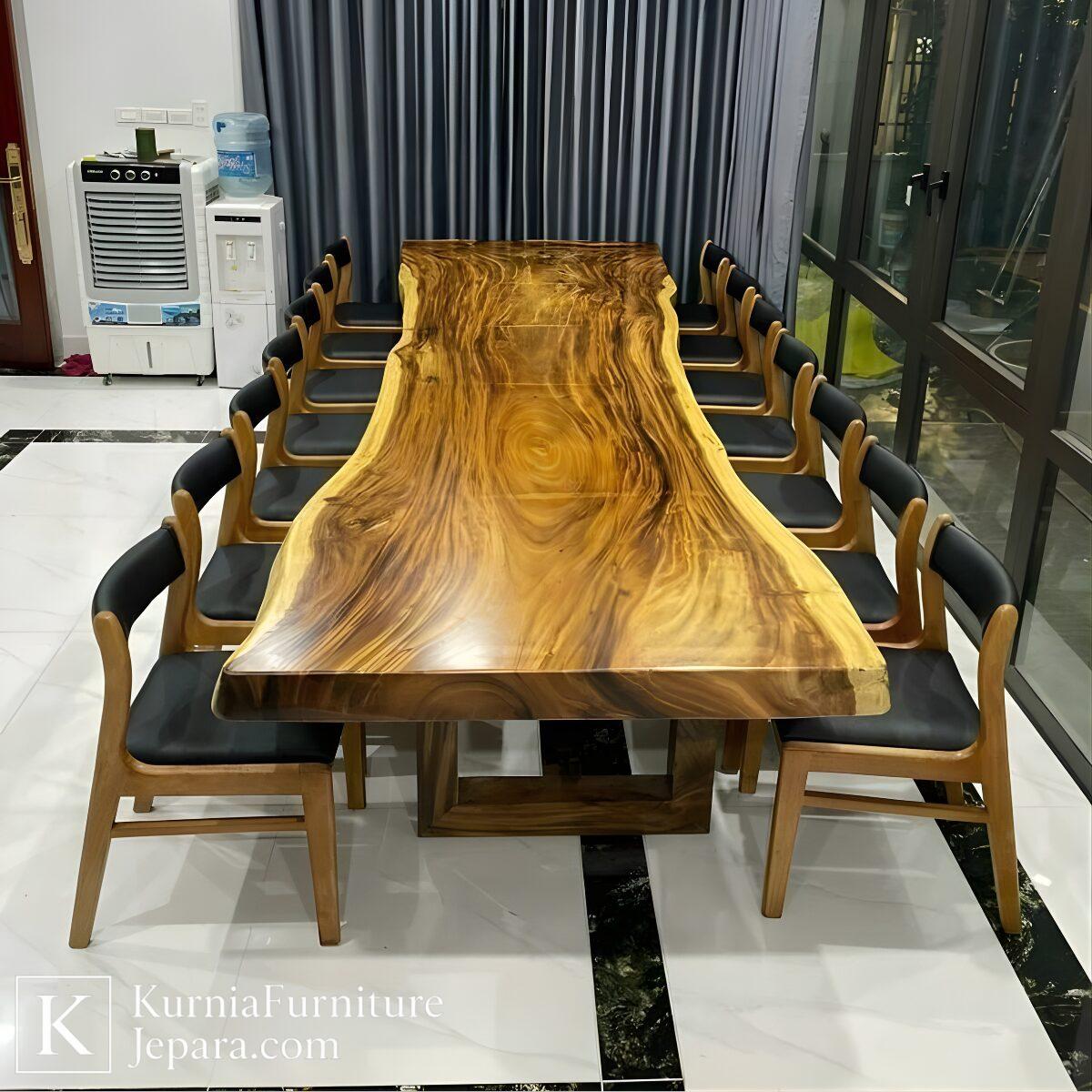 Meja makan kayu trembesi utuh dengan pola serat alami, menampilkan kesan mewah dan eksklusif di ruang makan.