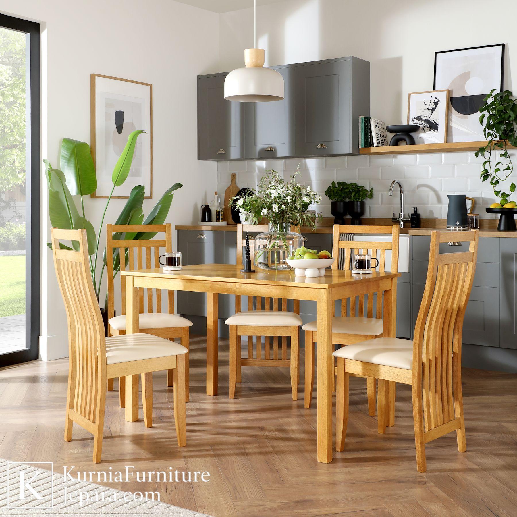 Set meja makan kayu minimalis ini dibuat dari material kayu berkualitas dengan konstruksi kokoh dan stabil. Permukaan meja halus dan kuat, nyaman digunakan untuk aktivitas makan bersama keluarga setiap hari. Empat kursi makan dirancang ergonomis dengan dudukan empuk sehingga tetap nyaman digunakan dalam waktu lama.
