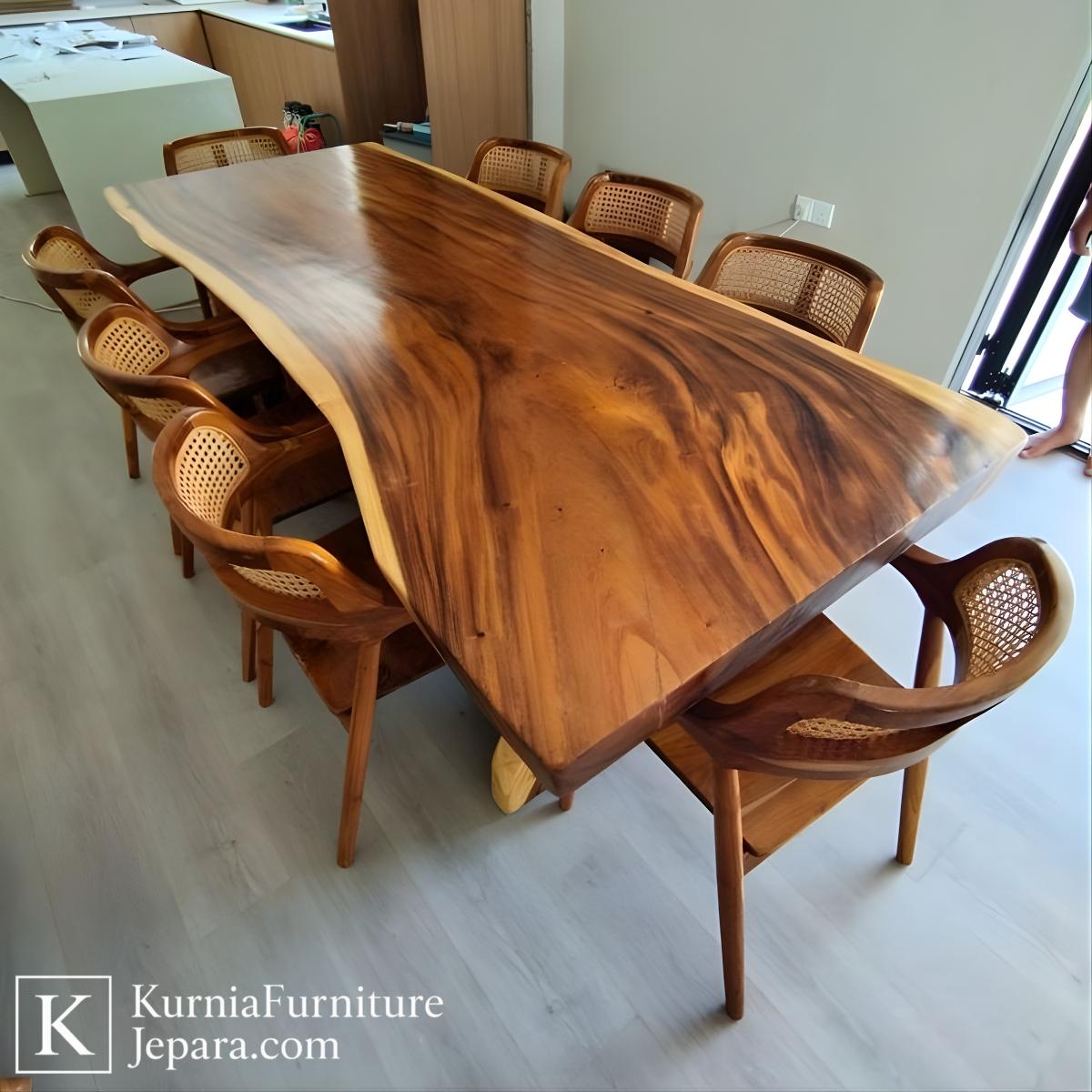 Meja makan trembesi Jepara dari kayu solid dengan serat alami dan desain live edge, dipadukan kursi kayu rotan elegan.
