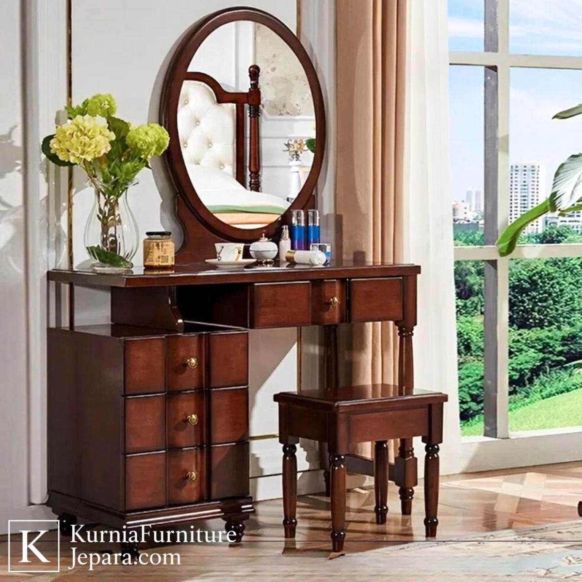 Meja rias klasik kayu jati dengan cermin oval dan desain elegan untuk kamar tidur
