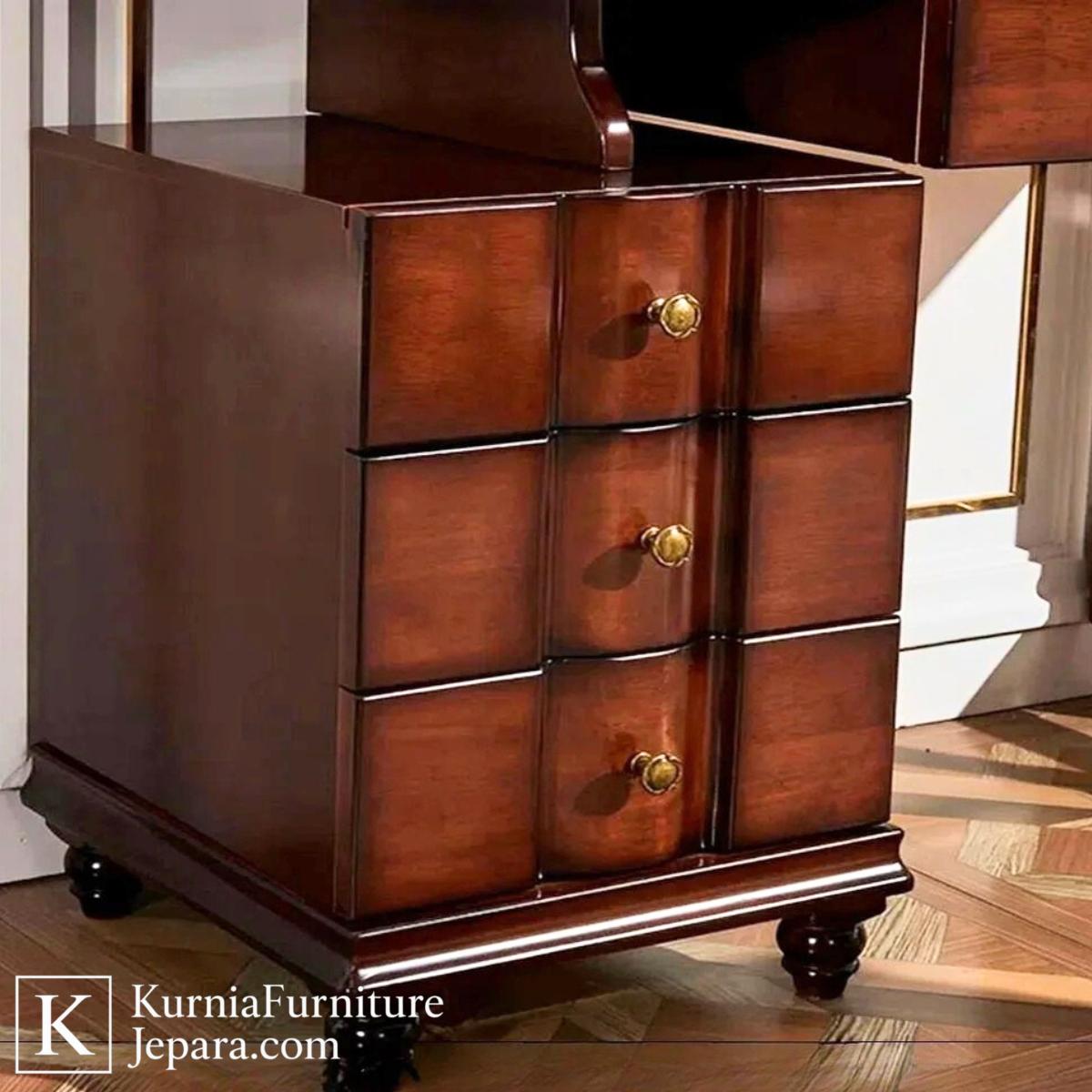 Dari sisi desain produk, meja rias klasik ini menonjolkan garis lengkung lembut yang khas furnitur klasik. Cermin besar berbentuk oval dengan bingkai tebal memberikan kesan elegan sekaligus fungsional karena memantulkan cahaya dengan baik. Susunan laci yang rapi di sisi meja dirancang simetris, menciptakan tampilan yang harmonis dan mudah dipandang. Detail kaki meja yang kokoh namun tetap berlekuk halus mempertegas kesan klasik tanpa terlihat berat. Desain ini menjadikan meja rias klasik cocok sebagai pusat perhatian di kamar tidur.