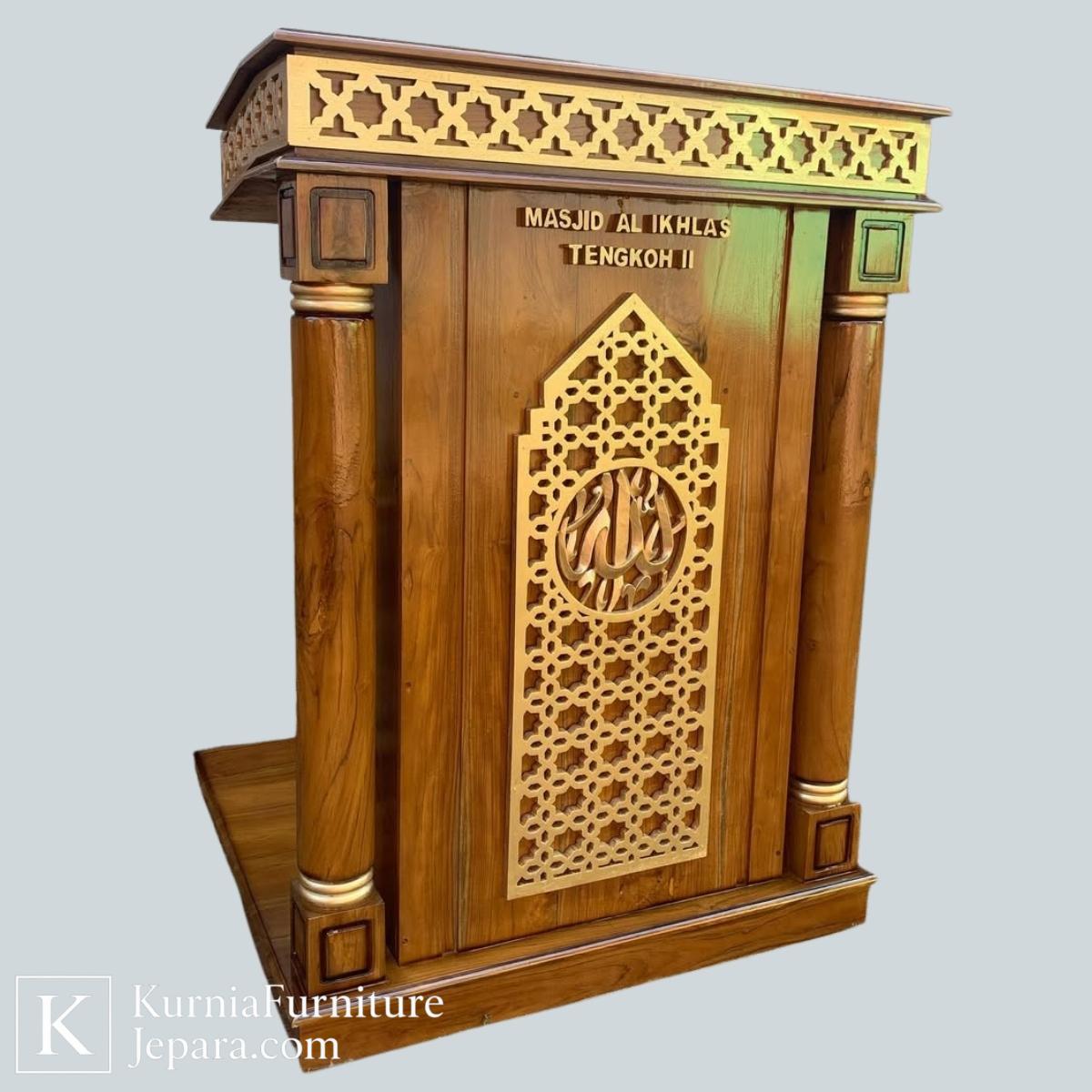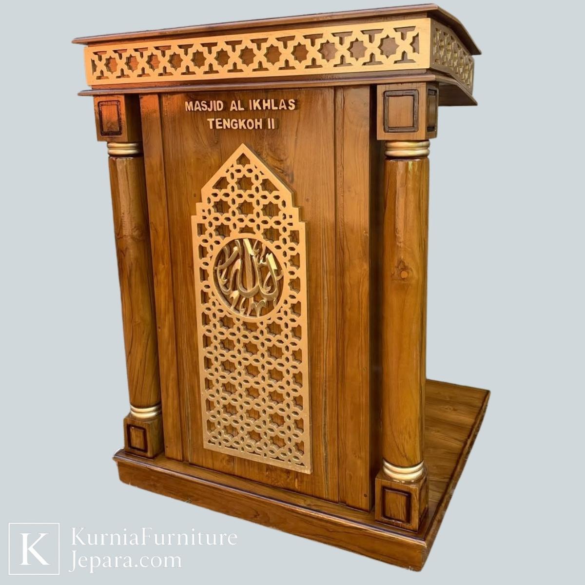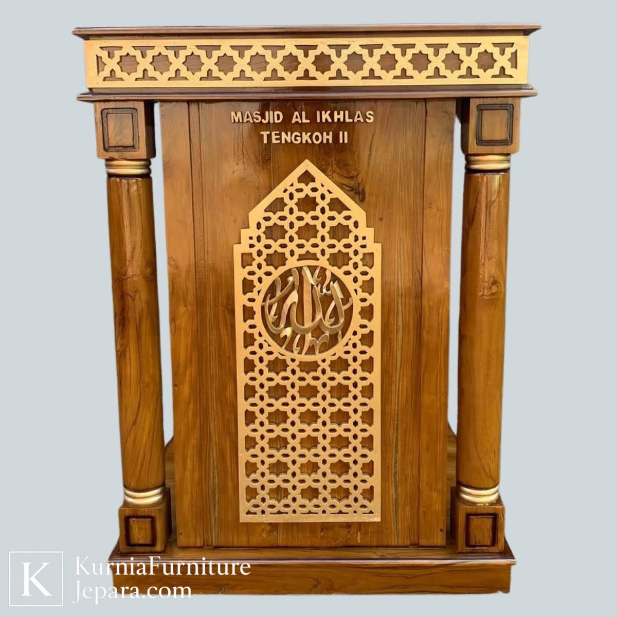 Mimbar kayu jati ini merupakan perpaduan antara keindahan seni ukir Islami, kekuatan material alami, dan fungsi ibadah yang sakral. Dirancang khusus untuk masjid dan mushola, mimbar ini menjadi pusat perhatian saat khutbah Jumat, ceramah, maupun kegiatan dakwah lainnya. Dengan tampilan yang berwibawa dan struktur yang kokoh, mimbar ini tidak hanya berfungsi sebagai tempat berdiri khatib, tetapi juga sebagai elemen interior yang memperkuat suasana khusyuk dan agung di dalam rumah ibadah.