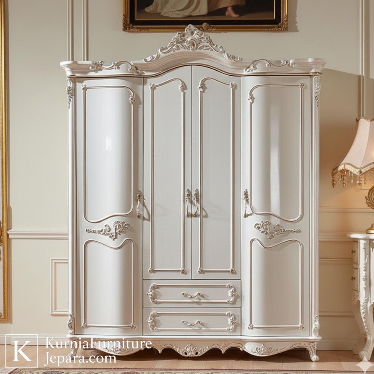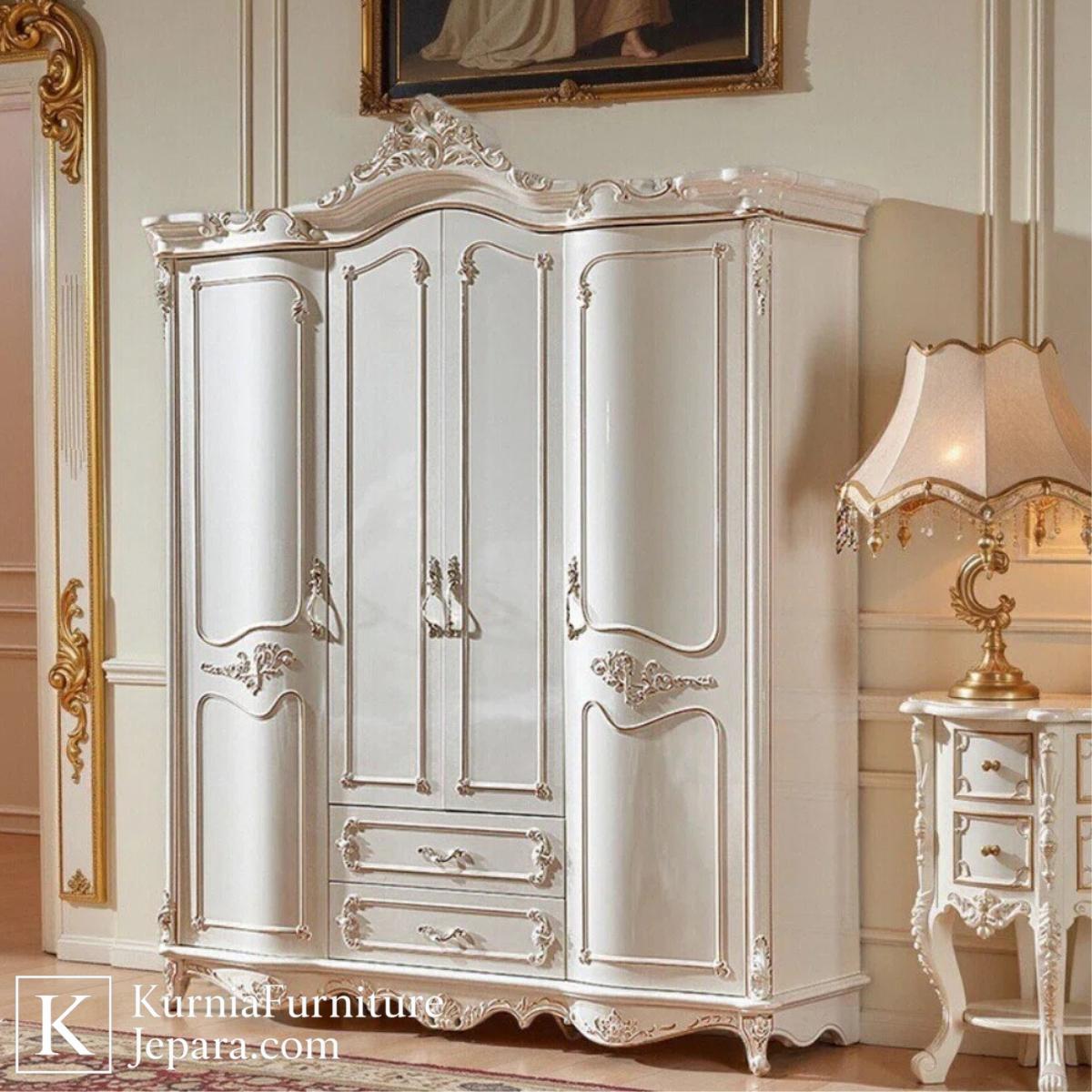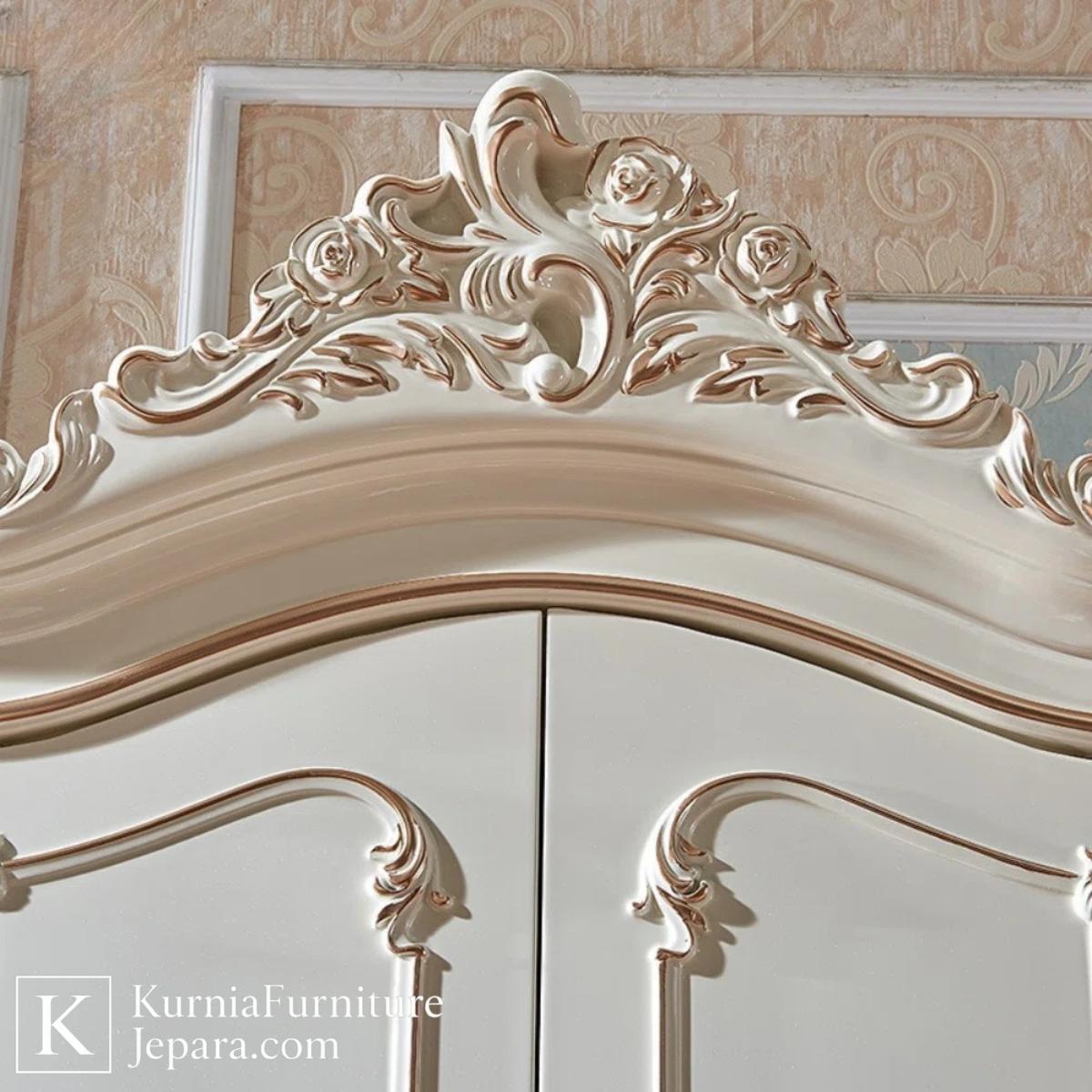 Lemari pakaian mewah modern klasik ukir warna putih dengan desain megah
