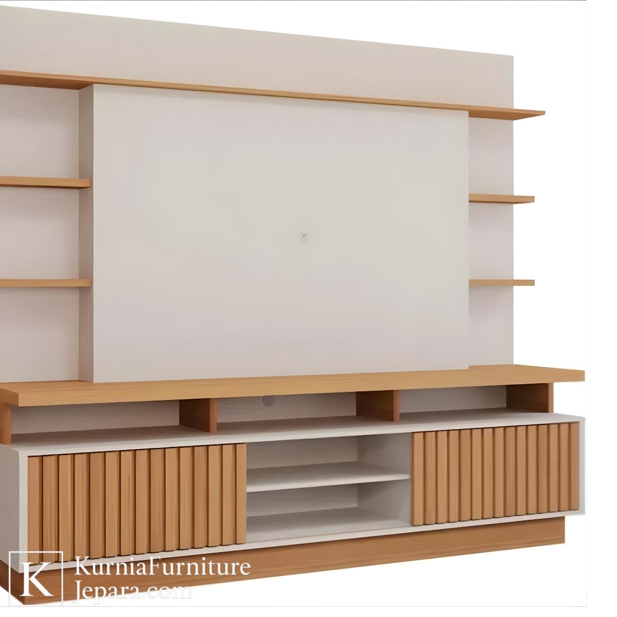 Struktur rangka dirancang stabil dan kuat untuk menopang televisi berukuran besar sekaligus menyimpan berbagai perangkat elektronik. Material yang digunakan tidak hanya indah dilihat, tetapi juga awet untuk pemakaian jangka panjang.