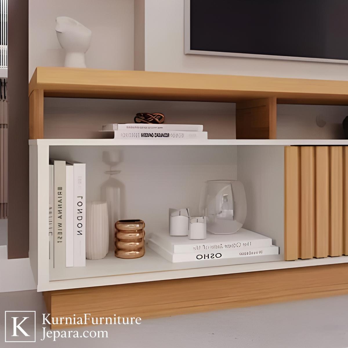 Kompartemen bawah menyediakan ruang untuk menyimpan DVD player, sound system, router, hingga koleksi buku atau majalah. Pintu geser dengan desain garis kayu vertikal memberikan akses mudah sekaligus menjaga tampilan tetap rapi.